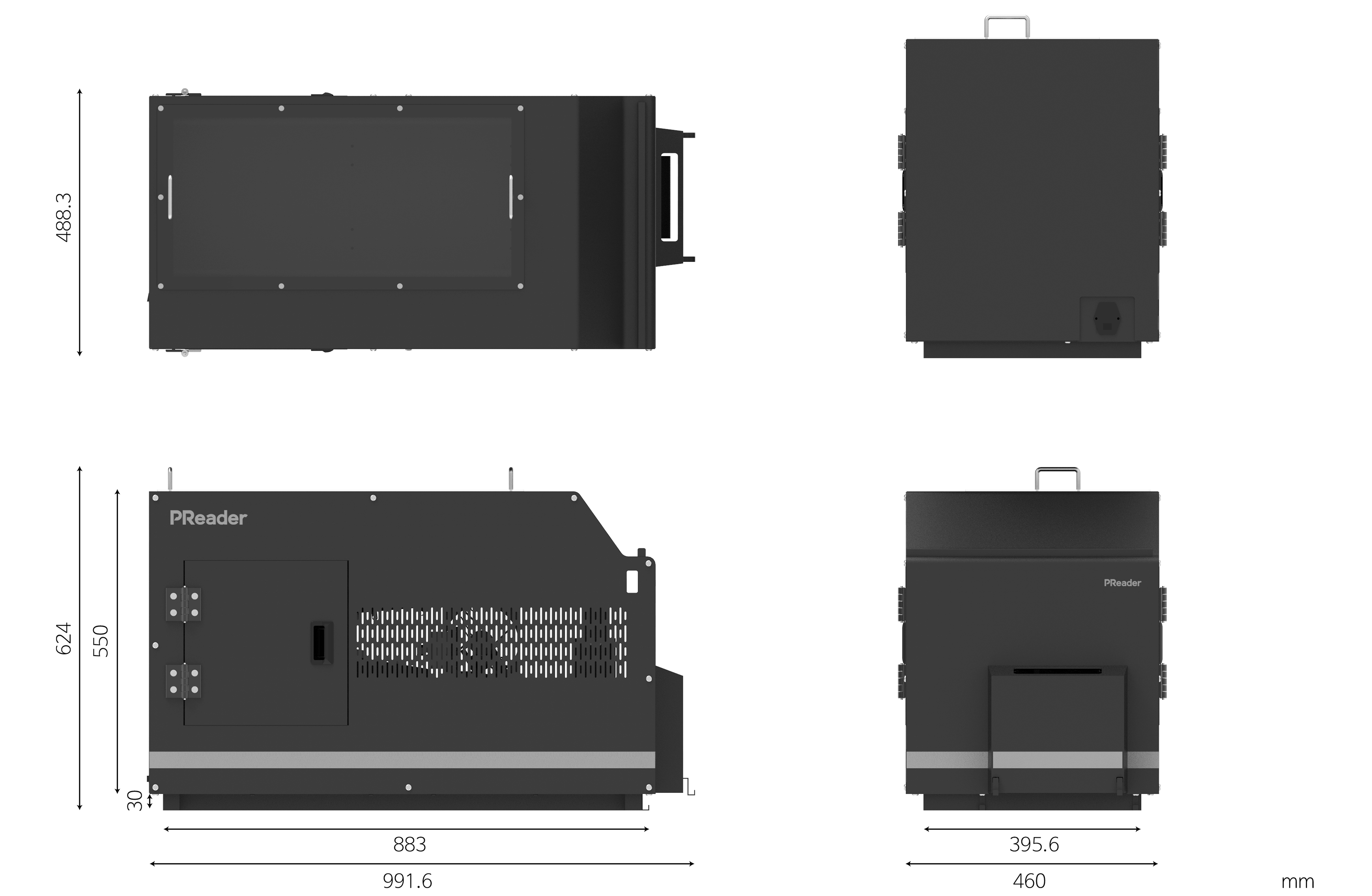PuryChecker is 991 cm in length, 488 cm in width, and 624 cm in height. It is a table type device that produces results based on the ratio of single material plastics derived from evaluating plastic flake pieces inputted using NIR sensors.
